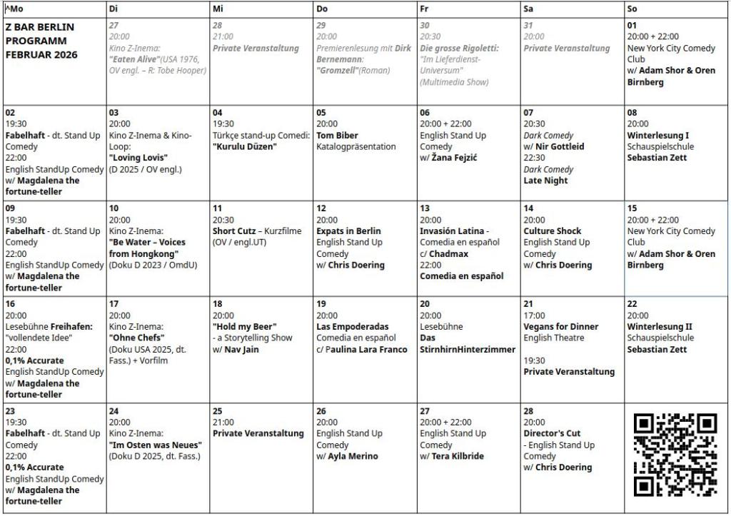 As a guest at the Z-BAR you are welcome to become a friend and join us on our journey through the wonderful world of the the fine art of drinking. If you are also a friend of weird and rare movies, strange readings, small stage experiences and sideshows you won’t regret having found your way up to Bergstrasse 2, right in Berlin’s centre. We are open daily from 7 p.m. till late.